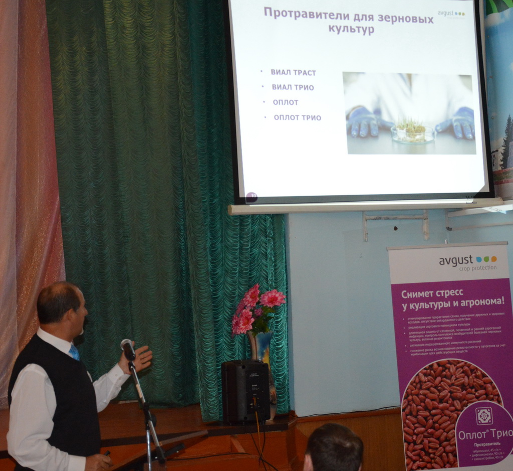 Семинардын лектору "Август" фирмасынын технологиялык коштоо боюнча жетектөөчү адиси ю.а. Усачев болду. Ал Кылкандуу дан эгиндерин, кант кызылчасын жана жүгөрүнү аймакка мүнөздүү зыяндуу объекттерден коргоо боюнча негизги куралдар тууралуу айтып берди. Семинарга тажрыйбалуу технологдор да катышып, кыскача билдирүүлөрдү жасашты "Августа".