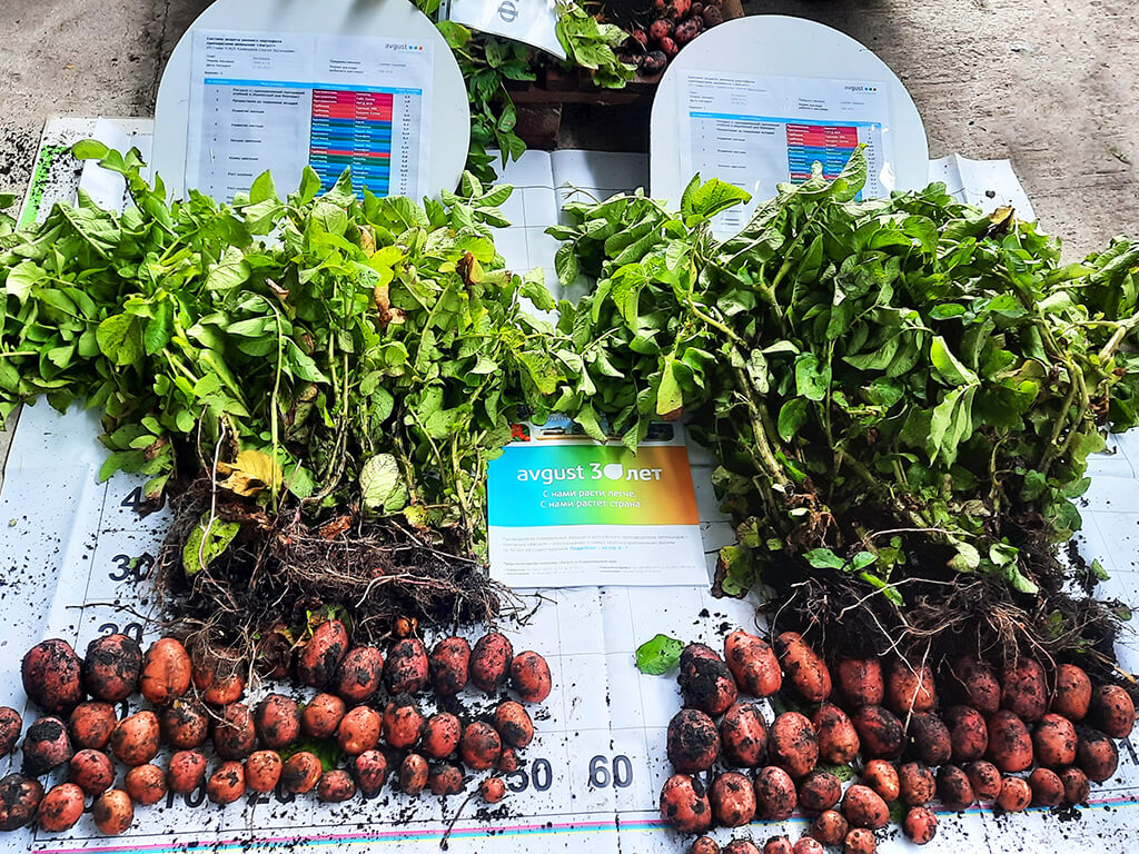 "Август" диапазону ийкемдүү картошка коргоо системасынын элементтерин өзгөртүүгө мүмкүндүк берет. Өсүмдүктүн өнүгүшүнүн башталышында узакка созулган жаан-чачындарды эске алганда, топурак гербициддерин колдонуу натыйжа берген жок, ошондуктан "жалбырактардын өнүгүшү" фазасында чокулар жабылганга чейин лапис Лазули супер, 0,4 л/га + Эскудо, 0,02 кг/га + Адью, 0,1% р-р колдонулган.